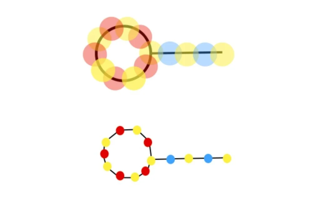 In Figure 1 above, we see a "lollipop shape" covered by balls, and below it we see the corresponding nerve construction. Variants could require that the cardinality of \(U_\alpha \cap U_{\alpha'}\) is bounded below by an integer \(k > 0\), or that the average density of points within \(U_\alpha \cap U_{\alpha'}\) is bounded below by a fixed positive real number. Another one would be that given two vertices \(v\) and \(w\), they are connected if the average distance between pairs of points \(x\) and \(y\), with \(x\) and \(y\) belonging to the sets corresponding to \(v\) and \(w\), is less than a given threshold. There are many more possible such criteria. Randomly chosen topological models are typically not very meaningful, but in the presence of a dissimilarity measure (likely a metric or distance function), one can construct models which represent the metric or relational properties of \(X\) effectively. The main observation is that subsets of the vertex set correspond to subsets of \(X\), since we can assign the subset \(\bigcup_{i=1}^{n} U_{\alpha_i}\) to the collection of vertices \(\{\alpha_1, \dots, \alpha_n\}\).