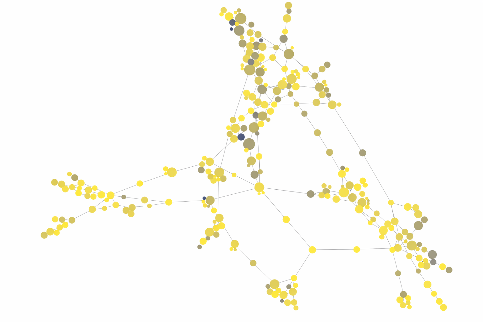 Figure 1. Example feature coactivation graph produced by Cobalt, used to identify target feature clusters. Semantically similar features tend to coactivate and are grouped into nodes, with semantically adjacent features appearing in neighboring nodes. The graph was constructed using a subset of BluelightAI’s Qwen3 CLT features. Node coloring indicates next-token activation frequency (log scale).